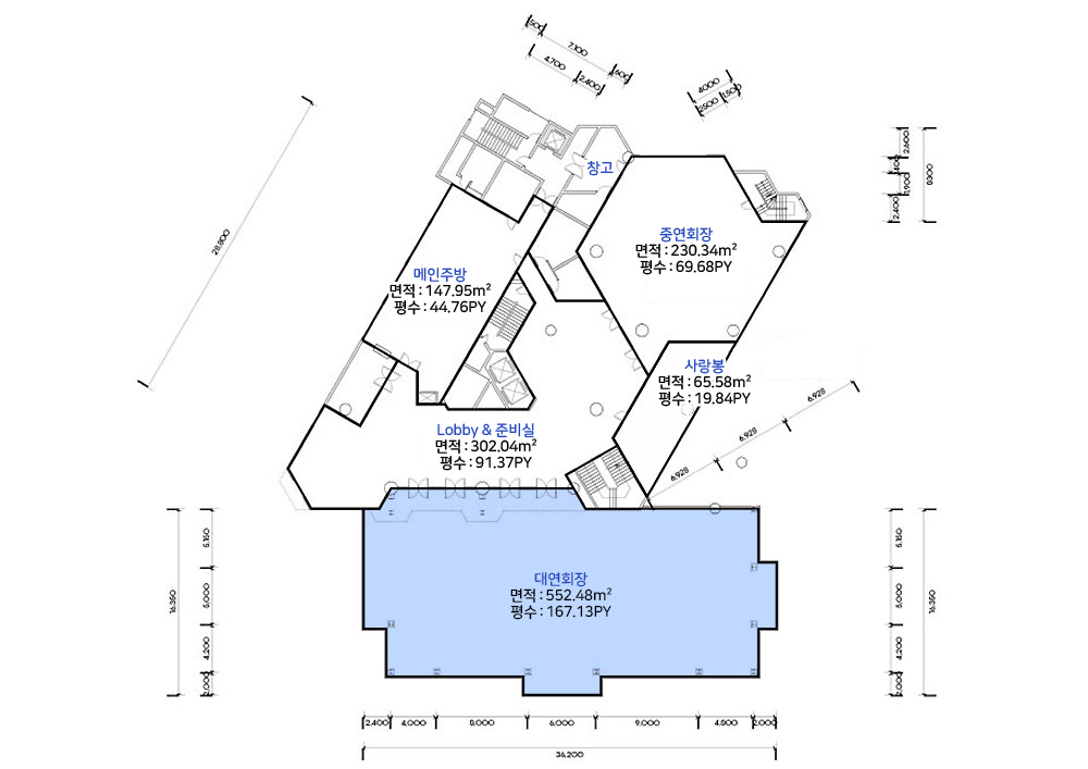 | 수용인원 | 450명 | 300명 | 150명 | 각각 20~30명 수용 | 라운딩 테이블 기준 | ||